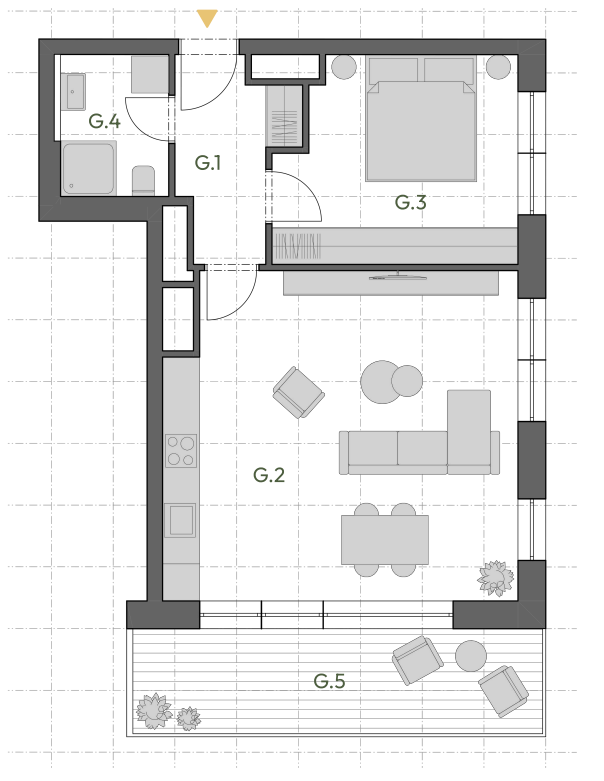 Pohodlný byt s oblíbenou dispozicí, která skvěle vyhoví páru i jednotlivci hledajícímu více prostoru. Denní část je navržená prakticky a umožní snadné zařízení i pohodlné fungování v každodenním režimu. Venkovní prostor navíc rozšiřuje možnosti využití bytu – ideální na posezení, zeleň i odpočinek. Umístění ve vyšším podlaží přináší více soukromí a klidnější atmosféru.